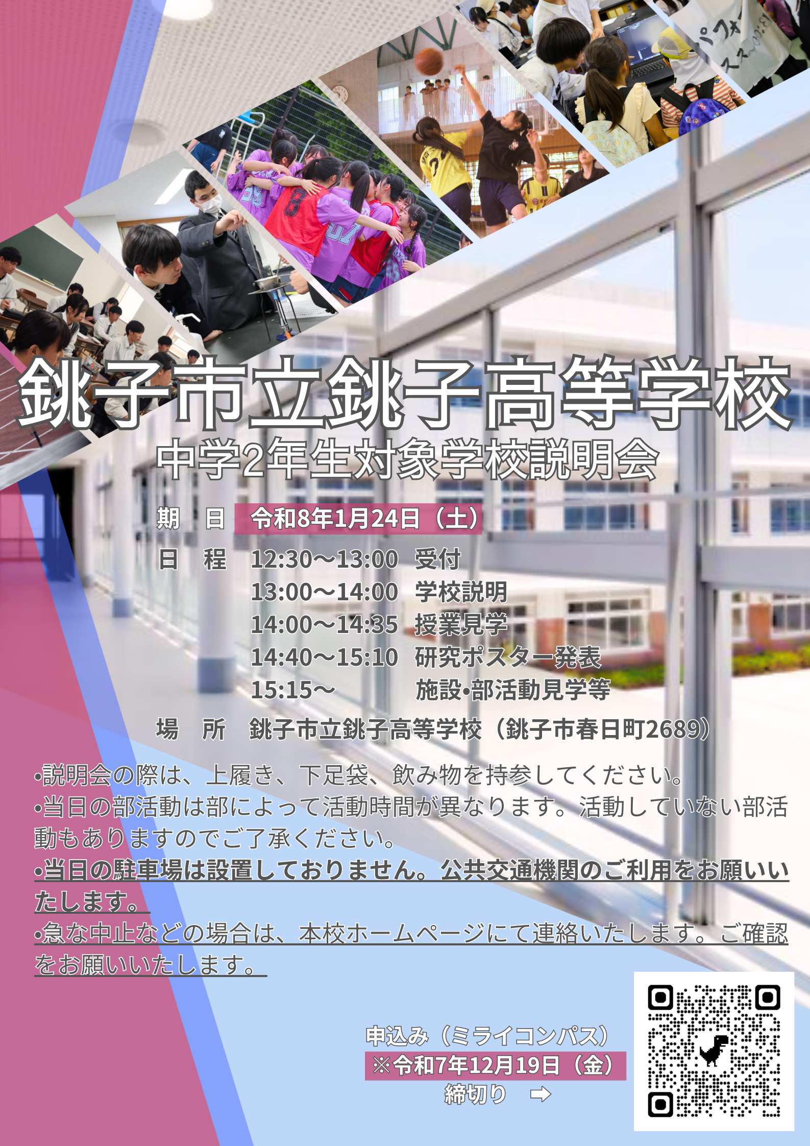 令和7年度は、中学3年生を対象として、一日体験入学(令和7年8月7日・8日)と、中学2年生を対象として学校説明会(令和8年1月24日)を実施します。